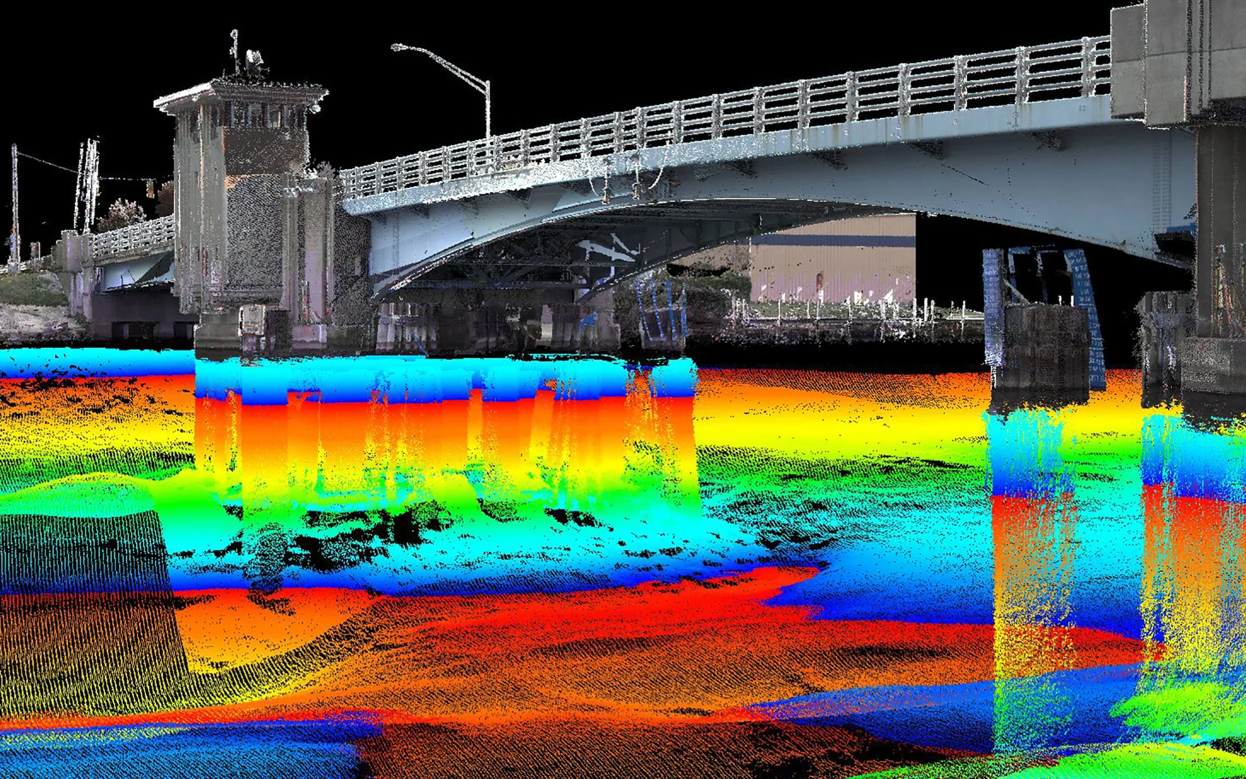Utilizing multibeam sonar technology and our mobile LiDAR system, Spicer Group completed LiDAR and sonar acquisition using the same vessel. The dense 3D data provided high-resolution mapping data of the channel bottom, including the vertical surface of the bridge pier structures. The high-resolution data provides engineers a highly detailed image of the severity of scour around each bascule pier. In addition, since scanning covered shoreline to shoreline, our team extracted the required hydraulic cross sections from the data to support development of the HEC-RAS model.