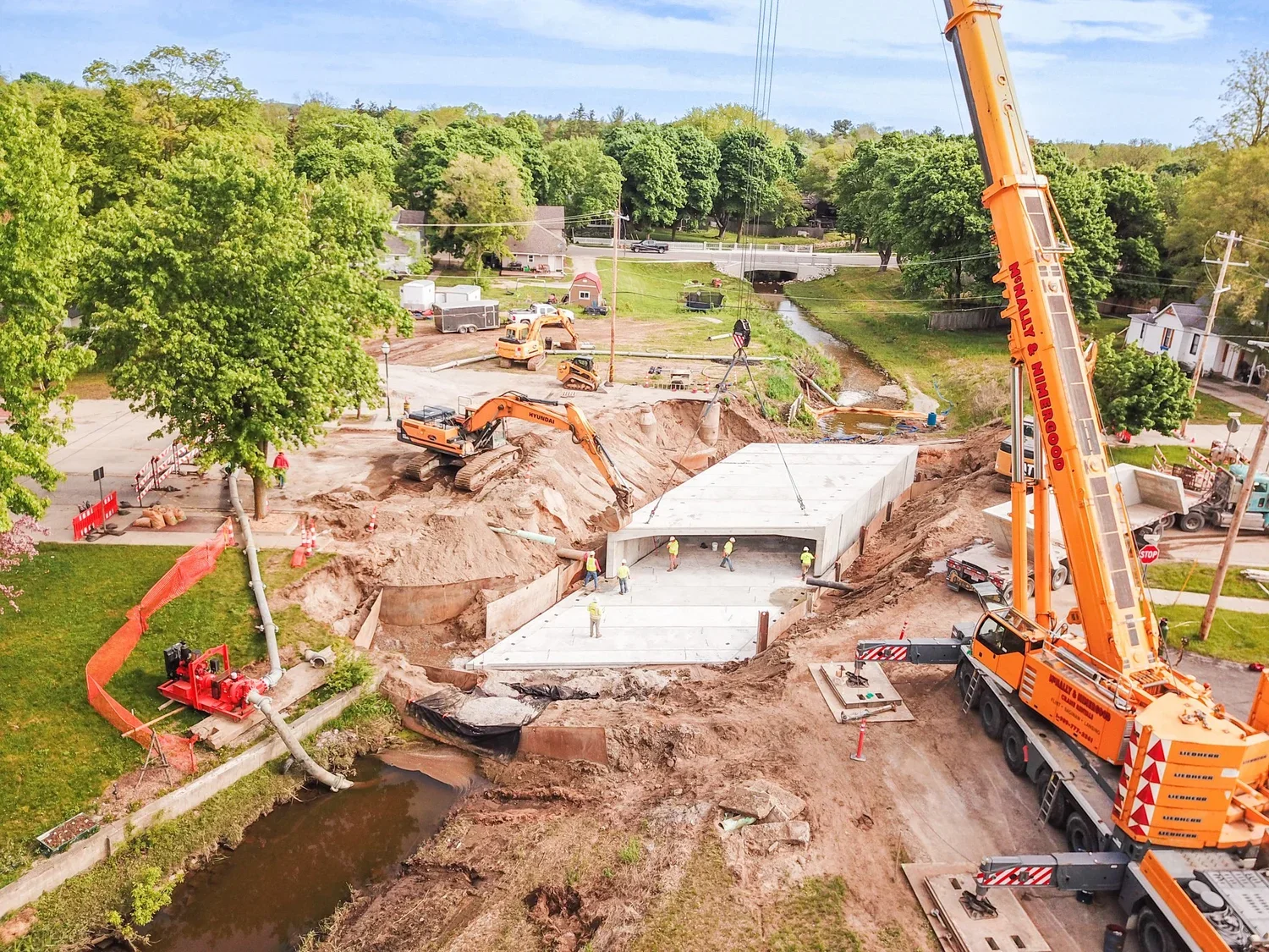 The Little Tobacco River Intercounty Drain begins in Grant Township in Clare County and travels nearly 2.83 miles southwest through the historic downtown in the City of Clare, crossing beneath 13 bridges. It was established in 1897 and services approximately 7,007 acres. Flooding within the City of Clare was a historic and proven threat and a hydraulics study completed by Spicer Group determined the bridges and drain were inadequate to support the 100-year storm floodplain.